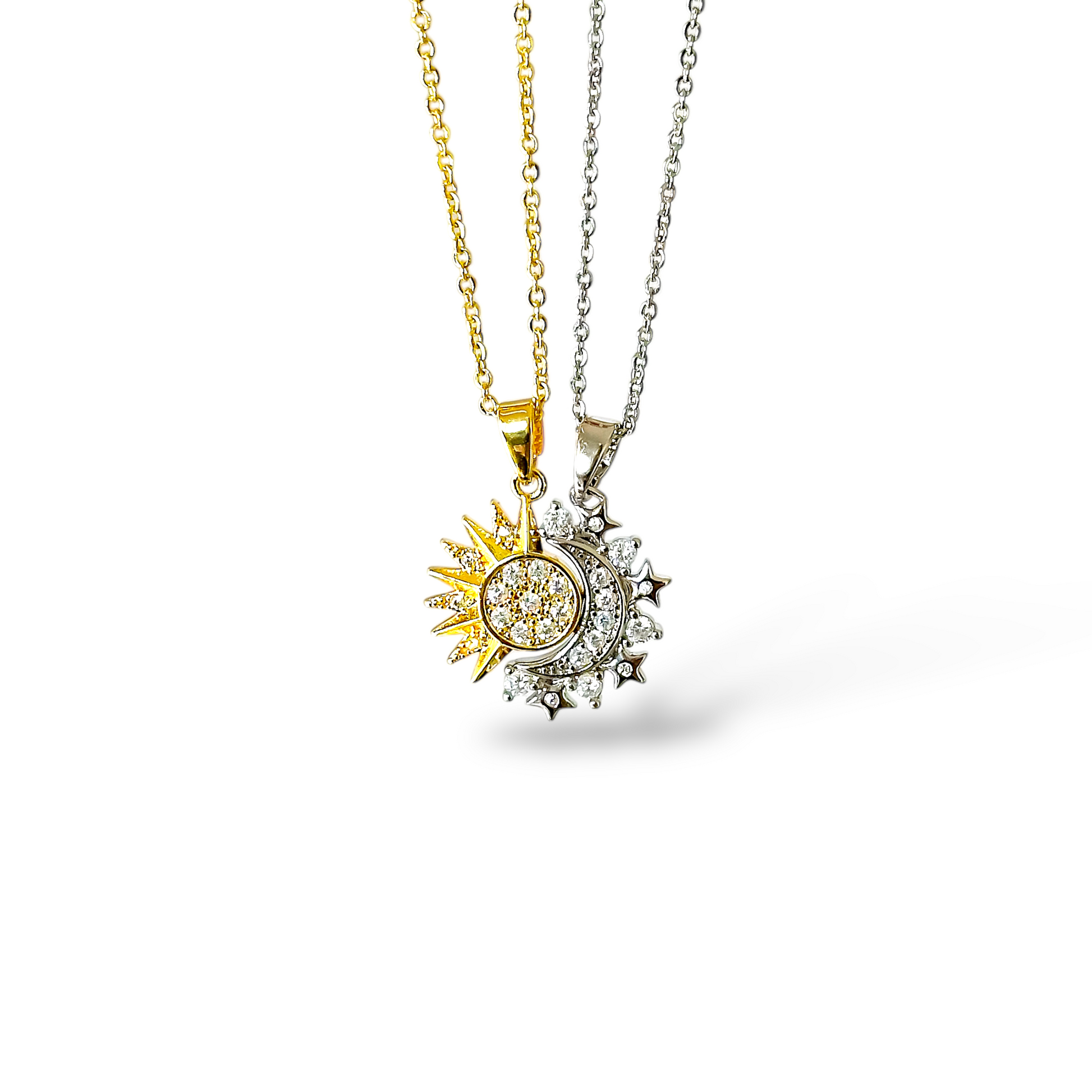 Incluye: Set de 2 cadenas con colgantes de sol y luna imantados.