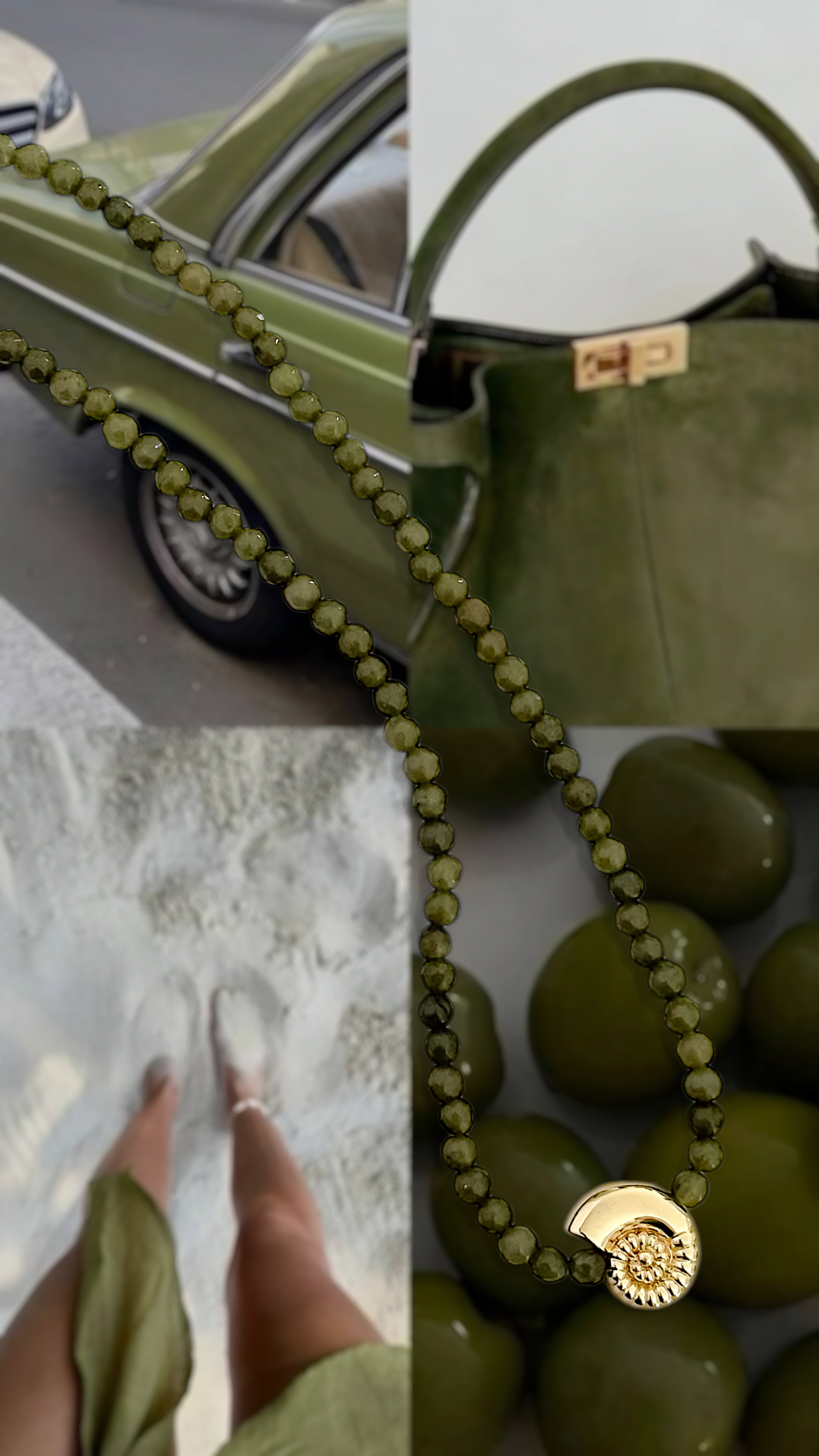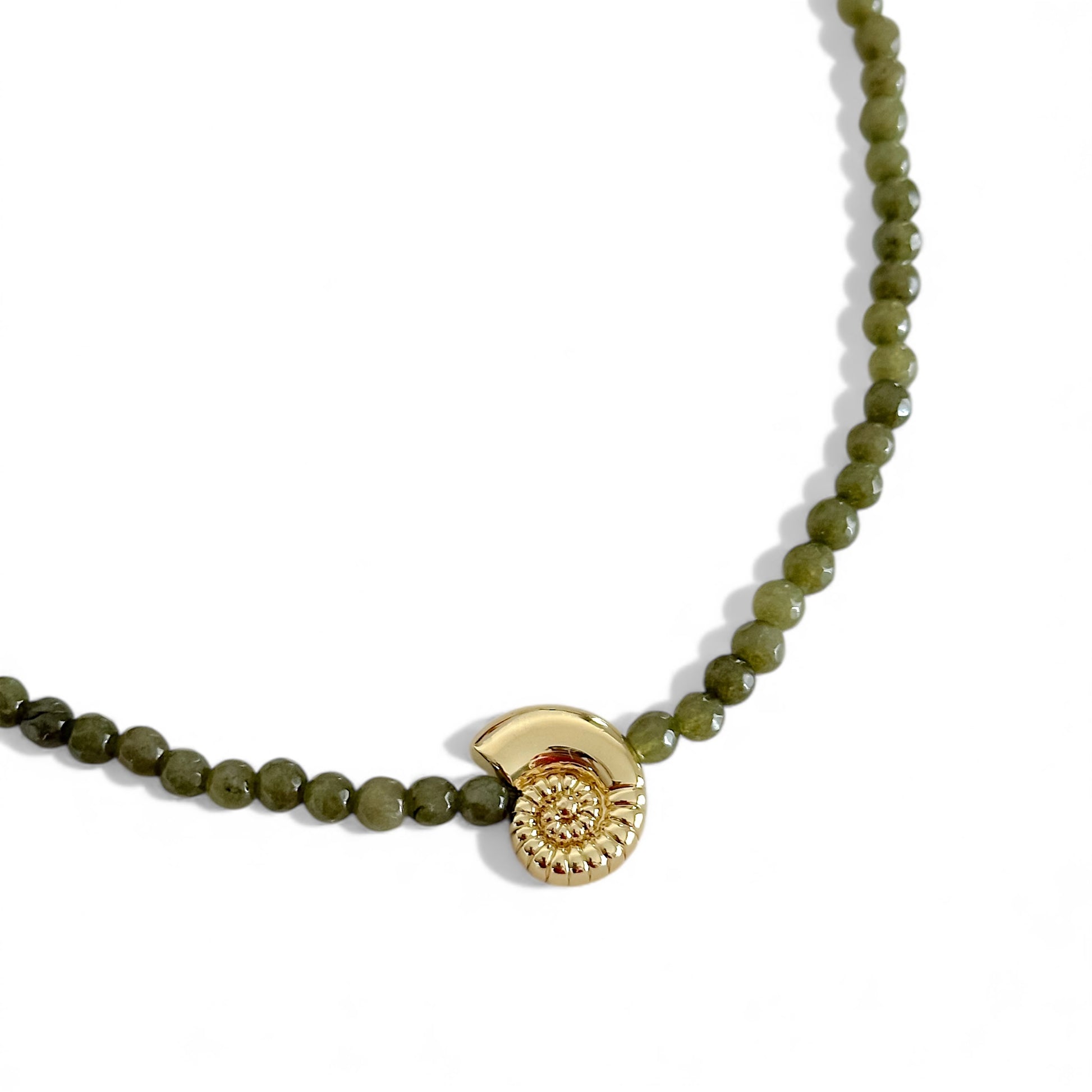 Cuentas de ágata facetadas en verde oliva con un dije en forma de caracol enchapado en oro 18K, la mezcla perfecta entre lo natural y lo trendy. Úsalo para un look fresco o en layering para un twist moderno y trendy!