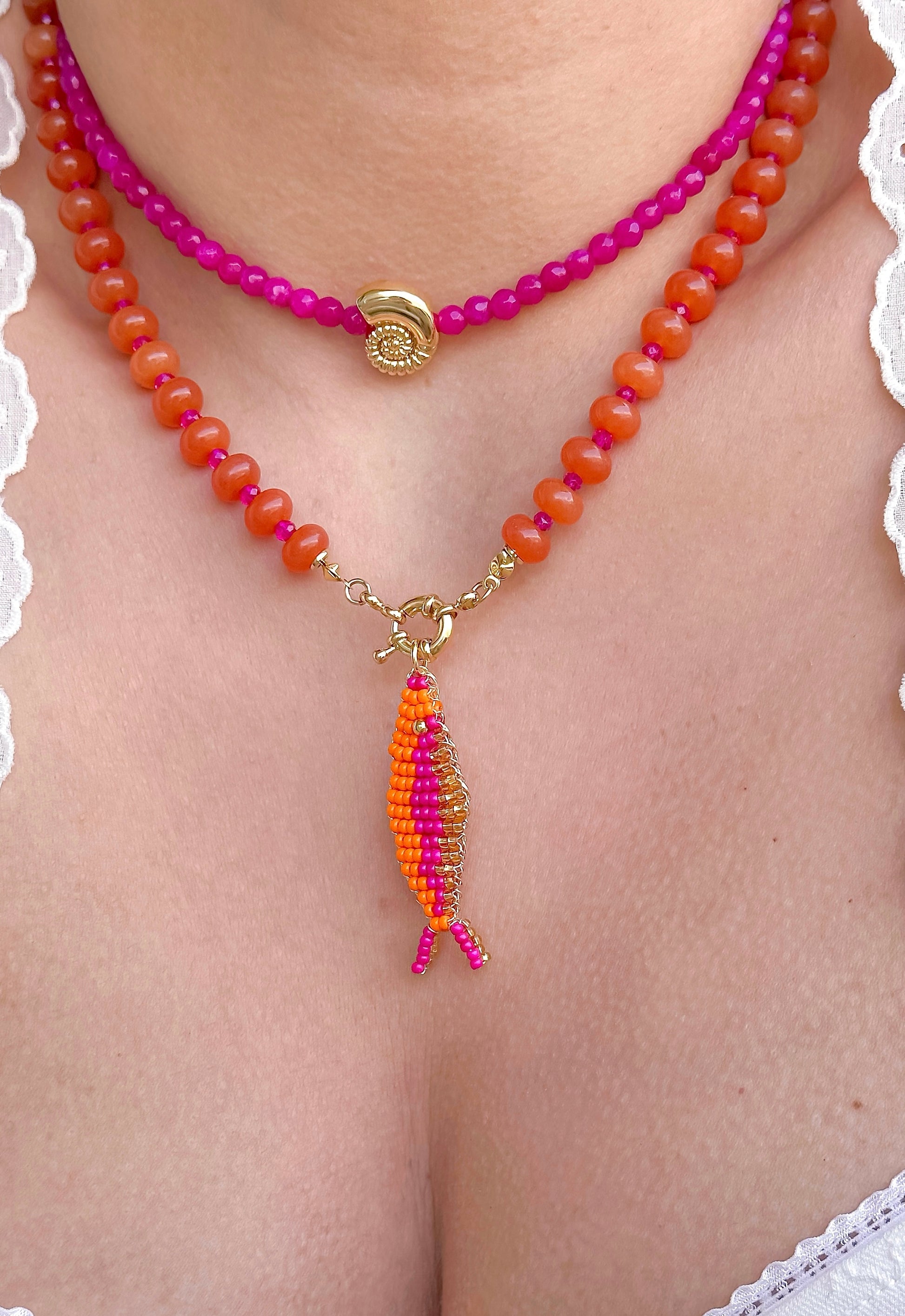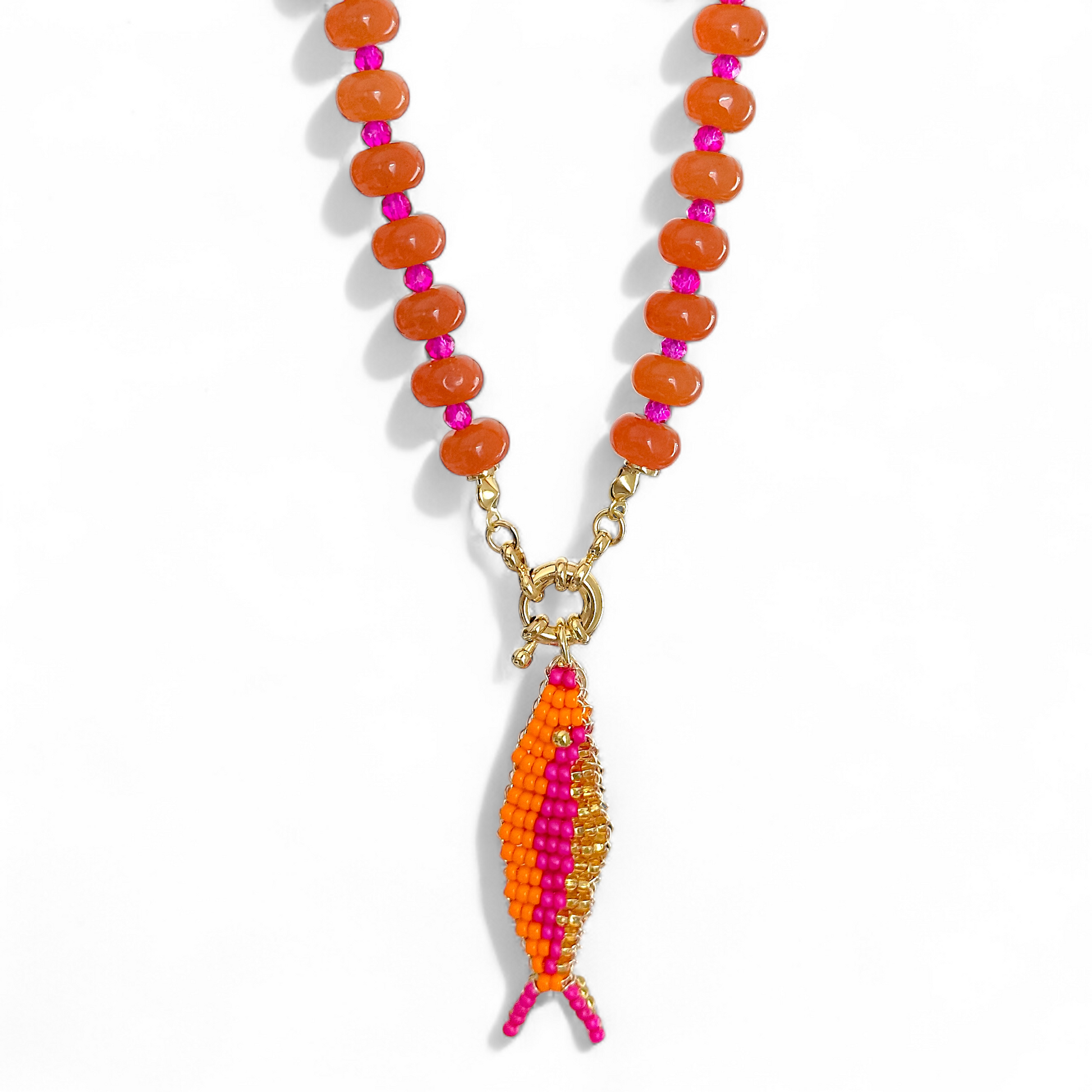 Ágatas en tonos naranja se combinan con un dije de pez artesanal en colores vivos que evocan atardeceres tropicales y días eternos de playa! 🐠🌴